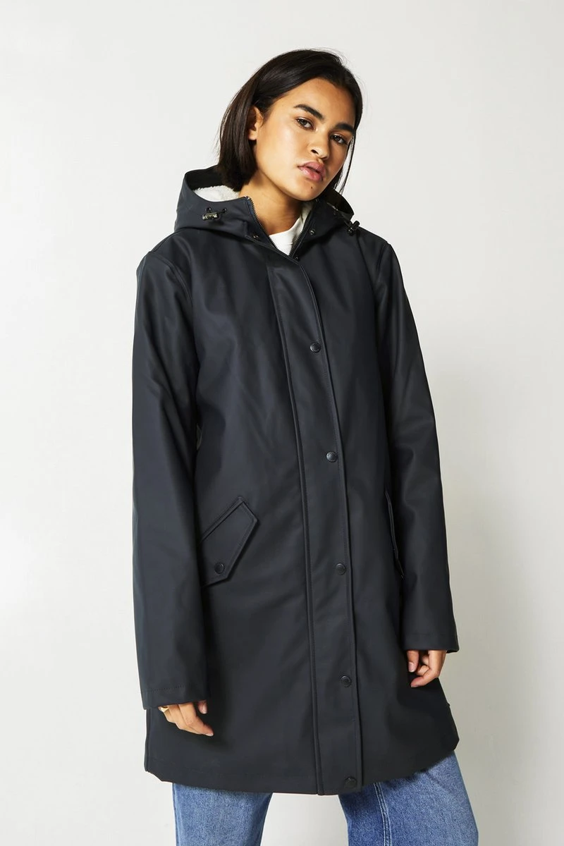 America Today dames regenjas. De Janice teddy is een lange regenjas met capuchon ideaal voor op de fiets. De capuchon kan doormiddel van een trekkoord aangetrokken worden voor extra bescherming. Daarnaast is de regenjas voorzien van een rits- en drukknoopsluiting en twee steekzakken met drukknoopsluiting. De teddy binnenstof houd je lekker warm tijdens de koude regen dagen. Product details: • Straight fit • Vaste capuchon • Teddy binnenkant • Rits- en drukknoopsluiting