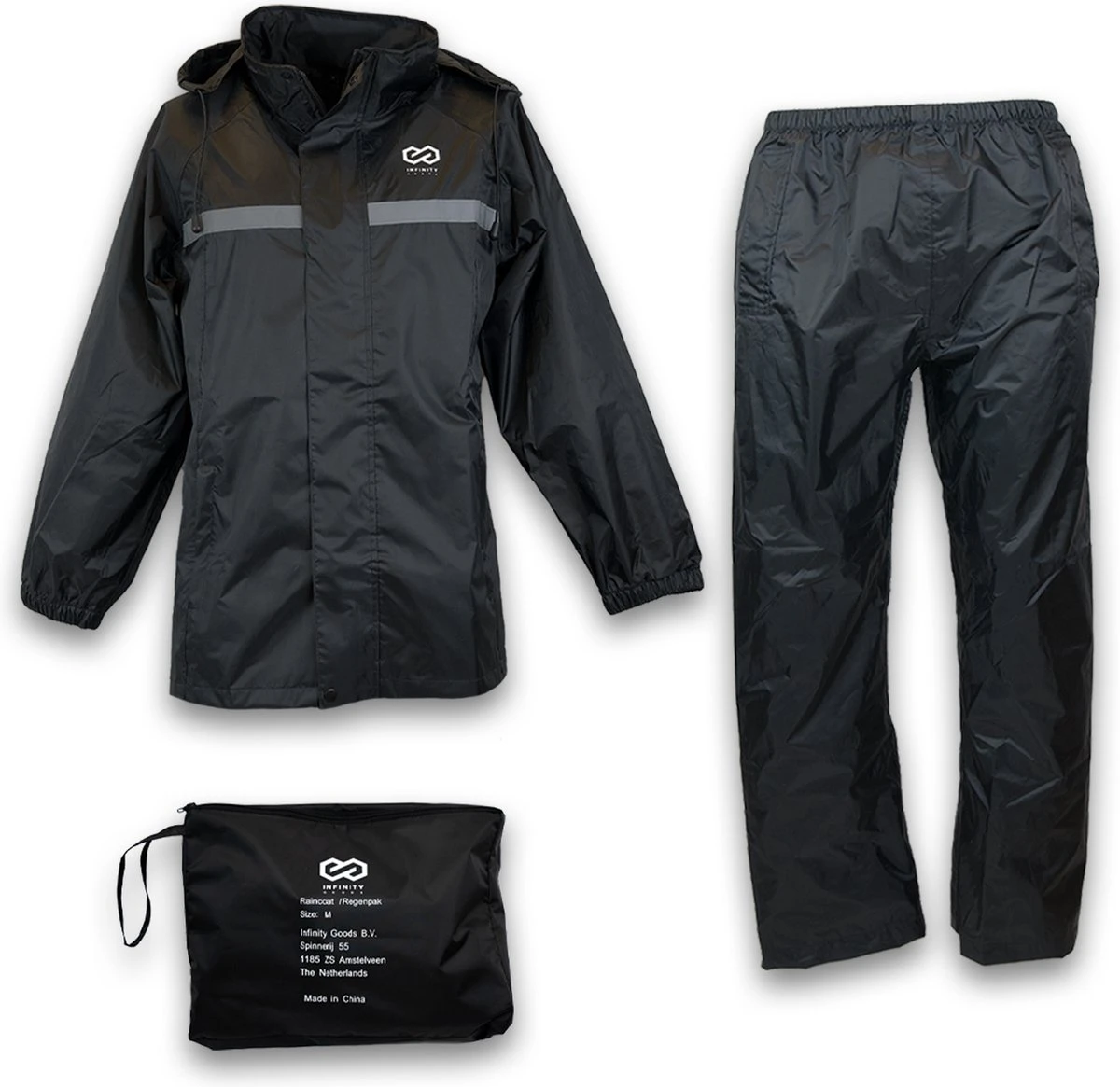 Ben jij ook klaar met doorweekte kleding en nat haar? Met het 2-delige Infinity Goods regenpak blijf jij zelfs met de hevigste regenbuien lekker droog. Of je nu de hond gaat uitlaten, of naar het werk fietst, dankzij dit regenpak raak je nooit meer doorweekt. Het regenpak is gemaakt van hoogwaardig PVC waardoor het regenpak 100% waterafstotend is. Het regenpak zit comfortabel en ziet er trendy uit. Het jack beschikt over een rits waardoor u zelf kunt kiezen of u het regenpak met of zonder capuchon draagt. Verder heeft het pak overal getapete naden en ventilatieopeningen op de rug. Dit zorgt voor optimaal draagcomfort en luchtigheid. De broek beschikt over een elastische tailleband waardoor de broek altijd goed zit. Met de reflectiestrepen voor- en achter op het pak, ben je zelfs tijdens de zwaarste storm goed zichtbaar. Voortaan kom je zelfs met de hevigste regenbuien droog op locatie aan.