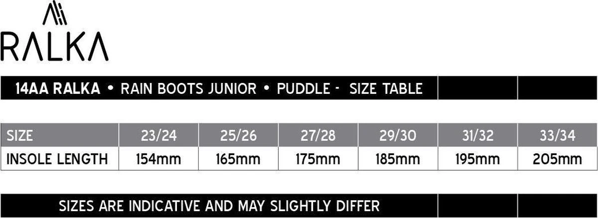 Stamp erop los in de plassen met deze stoere Puddle kaplaars van Ralka! De regenlaars is helemaal waterdicht en niet alleen perfect voor natte en koude dagen, je kunt er ook een dagje mee het bos in of mee spelen in de zandbak. Dankzij het grove profiel van de zool heb je een goede grip zodat je niet uitglijdt. De laars is verkrijgbaar in verschillende flitsende kleuren. Zo is er voor ieder wat wils. Voetjes warm en droog met Ralka!