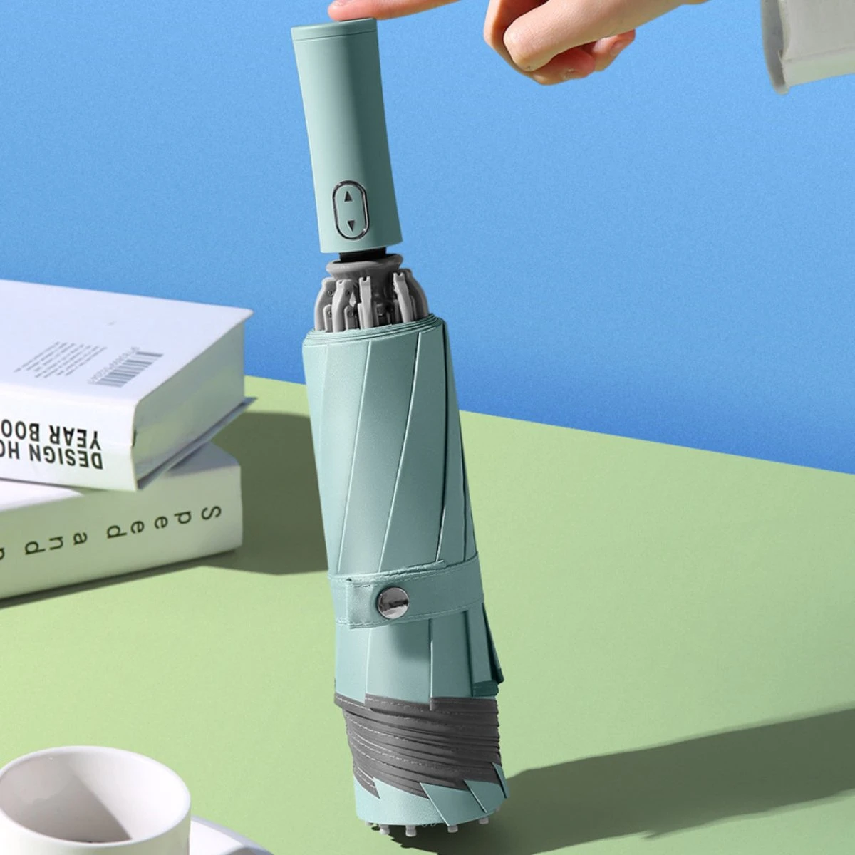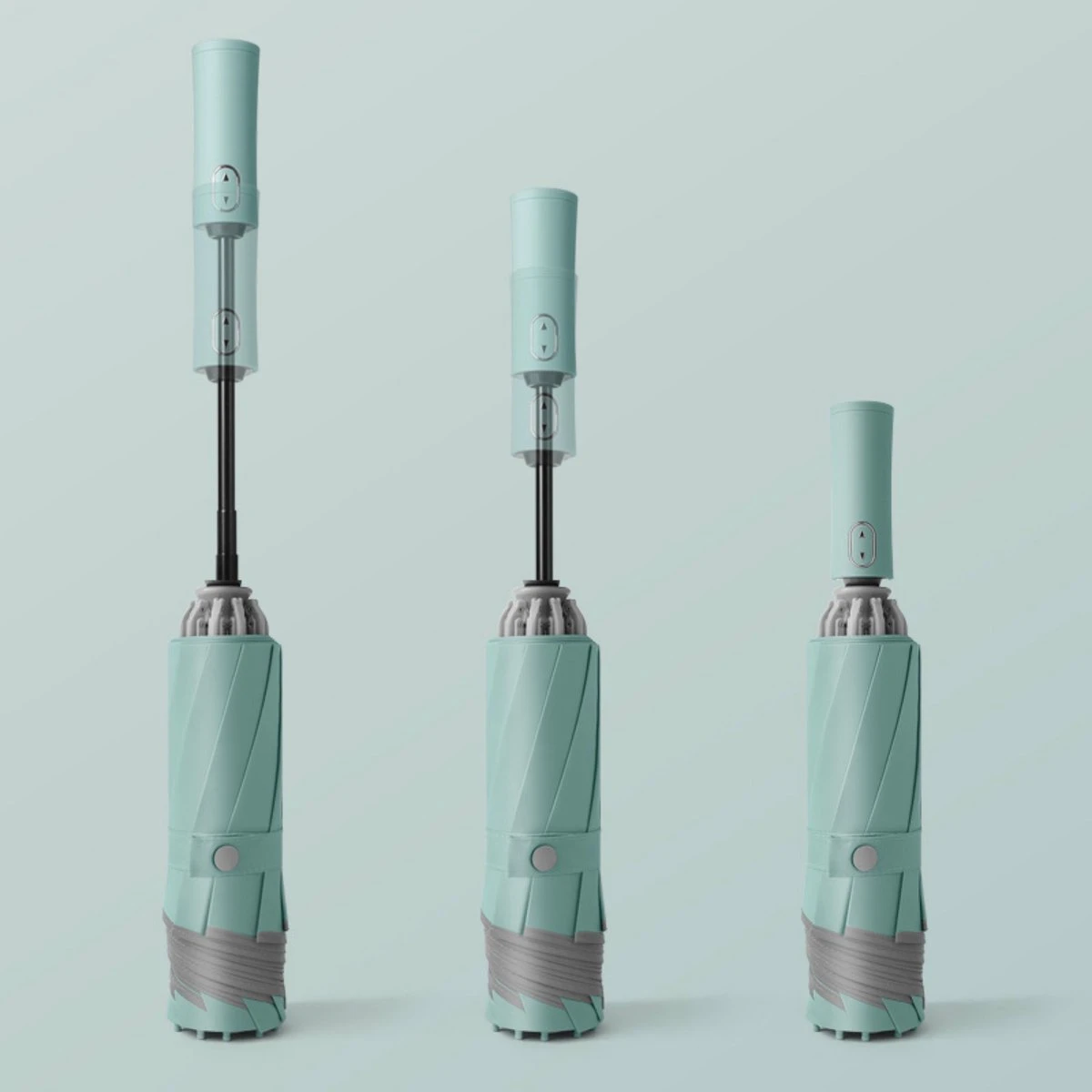 Druk één keer op de knop om automatisch te openen en druk nogmaals om de paraplu onmiddelijk te sluiten.